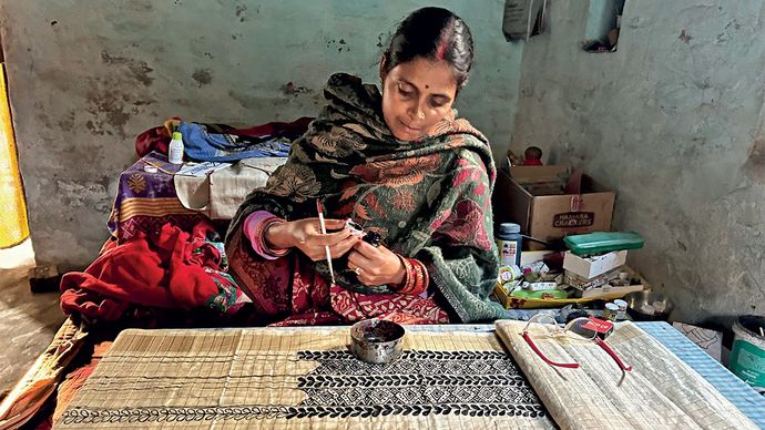 अंधेरे सीलन भरे अस्त-व्यस्त कमरे में खिड़कियों और दरवाजों से थोड़ी-सी रोशनी अंदर आ रही है. उसी रोशनी में वंदना कर्ण एक छोटी-सी चौकी पर रखी सिल्क की साड़ी पर मिथिला पेंटिग उकेर रही हैं. साड़ी के बॉर्डर पर काले रंग से उकेरे जा रहे ये चित्र काफी आकर्षक लगते हैं. वे कहती हैं कि उन्हें इस पूरी साड़ी पर चित्र उकेरने में 20-22 दिन लग जाएंगे. मेहनताना कितना मिलेगा? यह पूछने पर वे बताती हैं, ''2,500 रुपए.'' यानी एक दिन के मुश्किल से सौ, सवा सौ रुपए? बस!