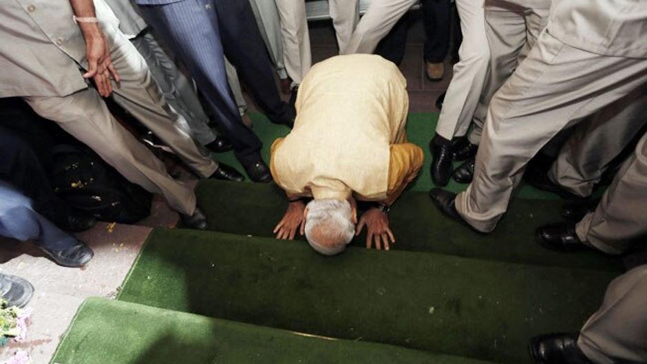 नरेंद्र दामोदरदास मोदी को 26 मई, 2014 को भारत के 15वें प्रधानमंत्री के रूप में शपथ दिलाई गई. यह देश में पहली बार आई स्थिर हिंदू राष्ट्रवादी सरकार के मुख्य कार्यकारी की शपथ थी. यह वाजपेयीनीत एनडीए जैसी गठबंधन की सरकार नहीं थी; एनडीए-2 बीजेपी की सरकार थी जहां गठबंधन सहयोगियों को, यहां तक कि शिवसेना जैसे पुराने सहयोगियों को भी बीजेपी नेतृत्व के आगे घुटने टेकने पड़े थे. यह समारोह अपने आप में मोदी का पुट लिए हुए था. इसे परंपरागत रूप से दरबार हॉल में नहीं बल्कि राष्ट्रपति भवन के बाहर आयोजित किया गया थाः यह समारोह एक ‘‘बाहरी’’ के आगमन और नए दिल्ली दरबार की मुनादी के लिए किया जा रहा था.