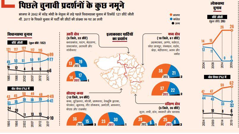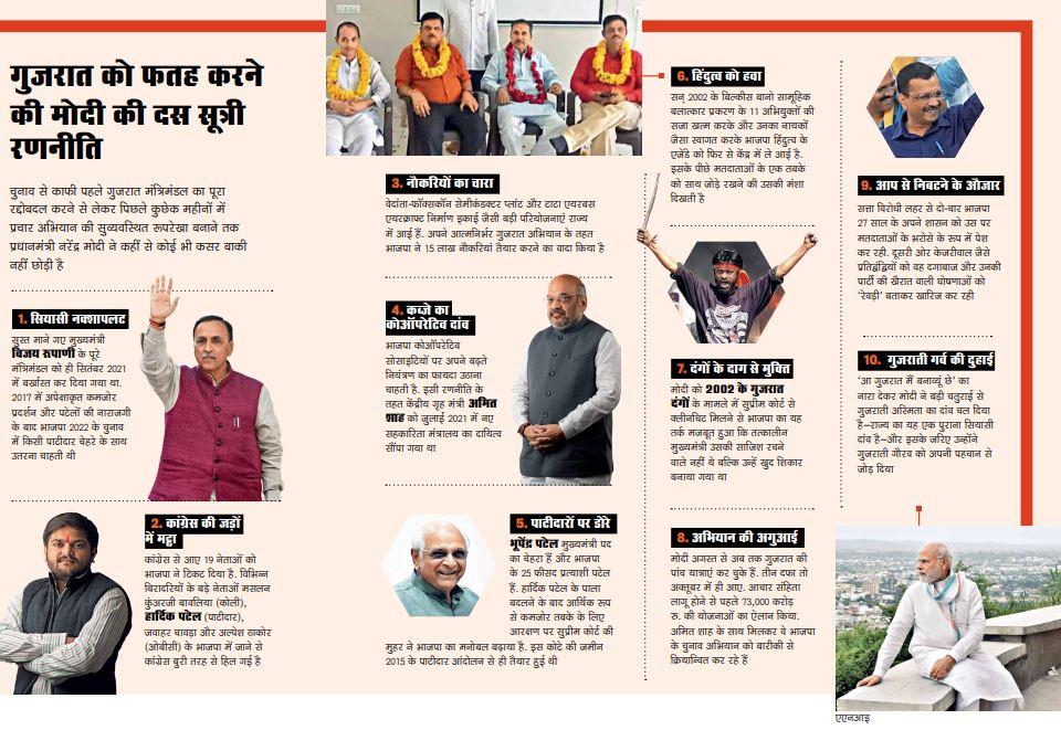 गुजरात में दो चरणों में मतदान होने हैं—1 और 5 दिसंबर को—और इसमें कोई संदेह नहीं है कि नरेंद्र मोदी भाजपा के लिए चुनाव के नतीजे तय करने में एक निर्णायक कारक होंगे. वे लगातार पार्टी के ट्रंप कार्ड बने हुए हैं. भाजपा गुजरात में पिछले 27 वर्षों से सत्ता में है. पार्टी के लिए सबसे बड़ा खतरा ऐंटी-इनकंबेंसी या सत्ता विरोधी रुझान है, और पार्टी अपना गढ़ बचाने के लिए दोगुनी मेहनत कर रही है.