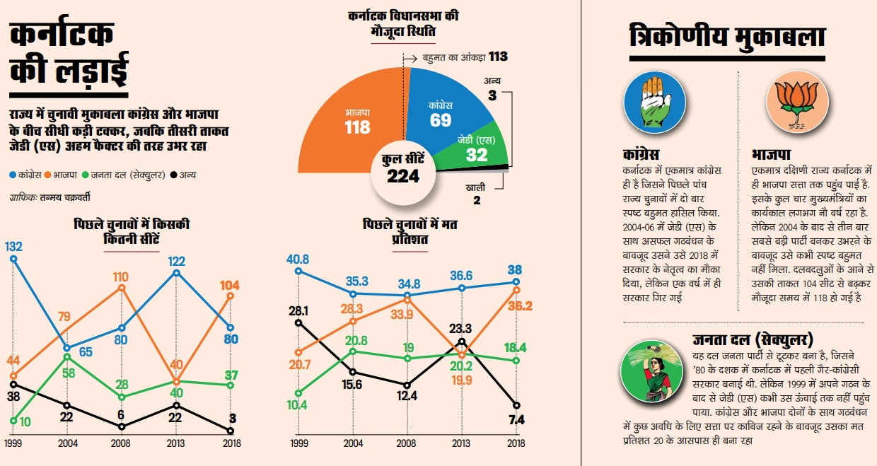 दोनों बड़ी पार्टियों में से कोई अपने दम पर बहुमत नहीं पातीं, जैसा कि हाल के अतीत में होता रहा है, तो ये संख्याएं महत्वपूर्ण हो जाती हैं. जेडी (एस) किंगमेकर बन उठता है और उसके नेता एच.डी. कुमारस्वामी किंग भी बन जाते हैं. 2006 और 2018 में, जेडी (एस) को क्रमश: 58 और 40 सीटें ही मिली थीं, लेकिन कुमारस्वामी एक बार भाजपा और फिर कांग्रेस के साथ हाथ मिलाकर मुख्यमंत्री बन गए, हालांकि दोनों दौर में उनका कार्यकाल बमुश्किल दो साल चला. भाजपा और कांग्रेस अब जेडी (एस) के फिर गरजने से सतर्क हो गई हैं और निर्णायक बहुमत पाने के लिए जोर लगा रही हैं.