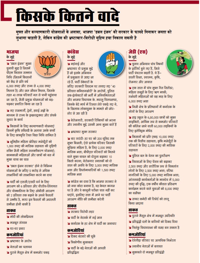नए राजमार्गों, रेलवे और हवाई अड्डों के माध्यम से कनेक्टिविटी और बुनियादी ढांचा अन्य विषय हैं. इसके साथ-साथ बोम्मई सरकार की कई कल्याणकारी योजनाएं हैं, जिनमें किसानों के बच्चों के लिए रैयत विद्या निधि छात्रवृत्ति; कृषि सब्सिडी; भूमिहीन महिला खेतिहर मजदूरों को 1,000 रुपए मासिक सहायता की गृहिणी शक्ति जैसी महिला सशक्तीकरण योजनाएं; कामकाजी महिलाओं और छात्रों को मुफ्त बस पास वगैरह हैं. बोम्मई कहते हैं, ''कुल मिलाकर, 'डबल इंजन’ योजनाओं से कर्नाटक की कुल 6 करोड़ आबादी में 5 करोड़ से अधिक लोग लाभान्वित हुए हैं. हमें विश्वास है कि यही सब हमें दूसरी बार जीत दिला देगा.’’