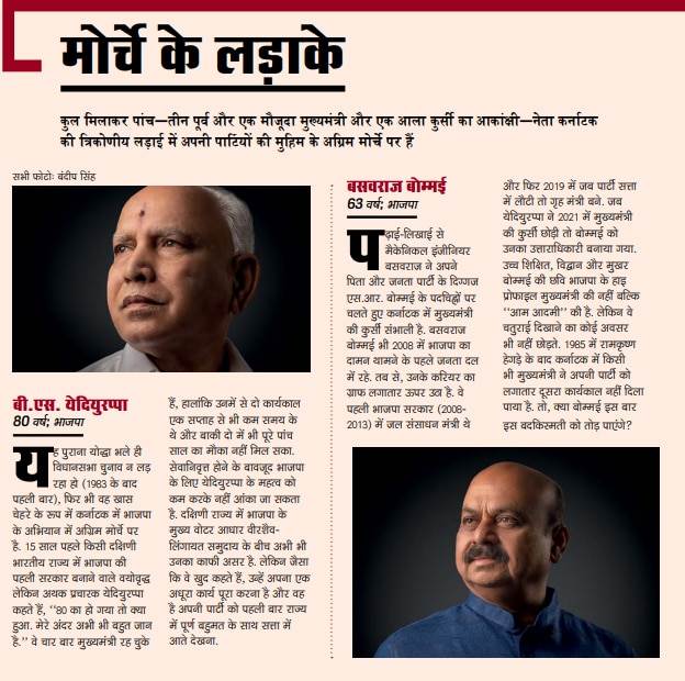 बोम्मई के समर्थक दो अन्य हालिया तथ्यों की ओर इशारा करते हैं—चुनाव रणनीति के सूत्रधार केंद्रीय गृह मंत्री अमित शाह ने कहा था कि चुनाव बोम्मई के नेतृत्व में लड़ा जाएगा. भाजपा अध्यक्ष जे.पी. नड्डा ने भी माना कि बोम्मई को सरकार में दो साल से कम का समय मिला, इसलिए पार्टी के जीतने पर उन्हें शासन करने के लिए कुछ और साल दिए जाने चाहिए. मुख्यमंत्री के एक सहयोगी ने कहा, ''हवा की दिशा साफ-साफ मुख्यमंत्री के पक्ष में है.’’ फिर भी, चुनावी रणनीति के तहत, पार्टी ने अभी तक खुले तौर पर मुख्यमंत्री पद के उम्मीदवार की घोषणा नहीं की है. नेतृत्व को लेकर अपने पत्ते नहीं खोलने के पीछे वाजिब वजहें हैं. उसी प्रकार कांग्रेस को भी सिद्धरमैया और कर्नाटक प्रदेश कांग्रेस अध्यक्ष डी.के. शिवकुमार के बीच नेतृत्व की उलझन को सुलझाना है.