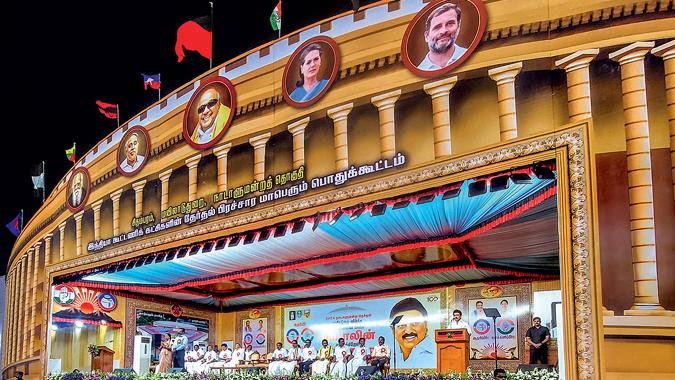 हालांकि, डीएमके और स्टालिन के नेतृत्व वाले एसपीए को हराना आसान नहीं होगा. एक तो, स्टालिन का चुनाव अभियान करीने से नियोजित होता है और उस पर बारीक से अमल किया जाता है. मंदिरों के शहर चिदंबरम में उनकी भारी रैली का मंच पुराने संसद भवन की आकृति का था और वहां सिर्फ पुराने डीएमके नेताओं की ही नहीं, सोनिया गांधी और राहुल जैसे सहयोगियों की तस्वीरें भी लगी थीं.