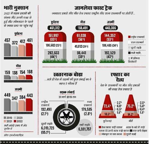अंधाधुंध ड्राइविंग हो, ट्रैफिक नियम लागू करने में ढिलाई, सड़कों की खराब डिजाइन या नाकाफी ट्रॉमा केयर, भारतीय सड़कों पर दुर्घटनाएं घटने का इंतजार करती रहती हैं. आंकड़ों के नवीनतम उपलब्ध स्रोत सड़क हादसों पर परिवहन मंत्रालय की 2022 की रिपोर्ट के मुताबिक, राष्ट्रीय राजमार्गों पर हादसों में गंवाई गई 70 फीसद जिंदगियों के लिए अकेले ओवरस्पीडिंग यानी बहुत ज्यादा तेज रफ्तार जिम्मेदार थी.