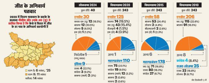इस बार दांव दूसरी वजहों से भी ऊंचे हैं. 2024 के लोकसभा चुनाव से पैदा हुए राजनैतिक माहौल में भाजपा के लिए महाराष्ट्र के बाद बिहार अगली बड़ी लड़ाई है, क्योंकि वह एक के बाद एक इलाके पर झंडा गाड़ने की कोशिश में है, ताकि लोकसभा चुनाव में अपने दम पर साधारण बहुमत खोने की नाकामी में सुधार किया जा सके. उस नाकामी से सरकार बनाने के लिए नीतीश के जद (यू) और आंध्र प्रदेश के चंद्रबाबू नायडू जैसे सहयोगियों की बैसाखी का सहारा लेना पड़ा था.