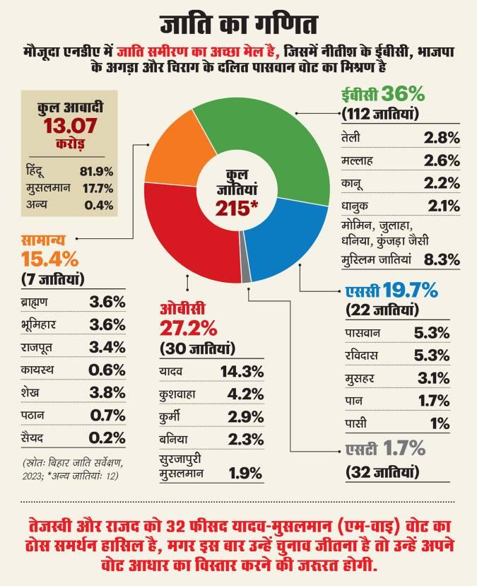 राजद अध्यक्ष की गद्दी पर नए-नए बैठाए गए तेजस्वी ने 2020 में लगभग असंभव को संभव कर दिखाया था. तब उन्होंने थके-हारे विपक्ष के दायरे को दस लाख सरकारी नौकरियों के साहसिक वादे से बड़े आंदोलन में बदल दिया था. इस बार, 35 वर्षीय तेजस्वी को उससे भी आगे की बुलंदी छूनी है और अपनी पार्टी तथा महागठबंधन दोनों को अंतिम लक्ष्य तक पहुंचाना है. चुनौती वही है- राजद के समर्थन आधार को मुस्लिम-यादव वोट बैंक से आगे ले जाना, जो उन्हें 30 फीसद वोटों की बढ़त तो दे देता है, लेकिन विधानसभा में साधारण बहुमत के लिए पर्याप्त सीटें नहीं दिला पाता.