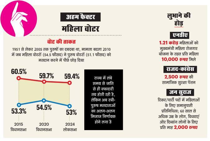आखिरी क्षण में जीविका, आंगनवाड़ी और आशा कार्यकर्ताओं के मानदेय भी बढ़ा दिए गए हैं, और 18-25 वर्ष की उम्र के बेरोजगार युवाओं को दो साल तक 1,000 रुपए के महीने के भत्ते की घोषणा भी की गई है. इसके अलावा एनडीए गठबंधन नीतीश के उस महिला जत्थे पर भी भरोसा करेगा जिसे उन्होंने पिछले दो दशकों में शराबबंदी के अलावा जनकल्याण योजनाओं और आरक्षण के जरिए बड़ी मेहनत से पाला-पोसा है. सचाई यह भी है कि 2010 से महिला मतदाता पुरुष मतदाताओं के मुकाबले ज्यादा तादाद में वोट देने आने लगी हैं. 2020 के चुनाव में पुरुषों के 54.5 फीसद मतदान के मुकाबले महिलाओं का मतदान 59.7 फीसद था. यह भी उनके पक्ष में अनुकूल कारक होगा.