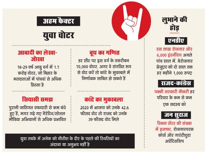 लोकनीति-सीएसडीएस के सर्वे के विश्लेषण के मुताबिक, 2020 में युवा वोट (18-29 वर्ष आयु वर्ग) दो गठबंधनों के बीच बंट गया था, जिसमें से 37 फीसद महागठबंधन को और 36 फीसद एनडीए को मिला था. उनके वोटों पर कब्जे की लड़ाई इस चुनाव में जारी रहने की संभावना है, क्योंकि 14 लाख मतदाता पहली बार वोट डालेंगे. बेरोजगारी और पलायन मुख्य मुद्दे बने हुए हैं.