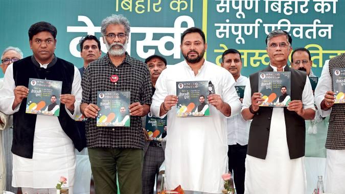 समाजशास्त्री तथा पाटलिपुत्र विश्वविद्यालय के प्रोफेसर ज्ञानेंद्र यादव कहते हैं, ''एम-वाइ समीकरण के अलावा महत्वाकांक्षी युवा मतदाताओं का एक बड़ा समूह आज तेजस्वी के नौकरियों के वादे की ओर आकर्षित होता दिख रहा है.’’ फिर भी, बकौल प्रोफेसर, उनके लिए ईबीसी और दूसरे जाति समूहों का दिल जीतना अहम चुनौती होगी. इसी के मद्देनजर कई वादे बुने गए हैं. मसलन, सभी भूमिहीनों के लिए शहरों में तीन डिसमिल और गांवों में पांच डिसमिल जमीन, आरक्षण पर 50 फीसद की सीमा हटाना, दलितों (और महिलाओं) के खिलाफ उत्पीड़न के लिए अलग न्यायिक व्यवस्था का गठन.