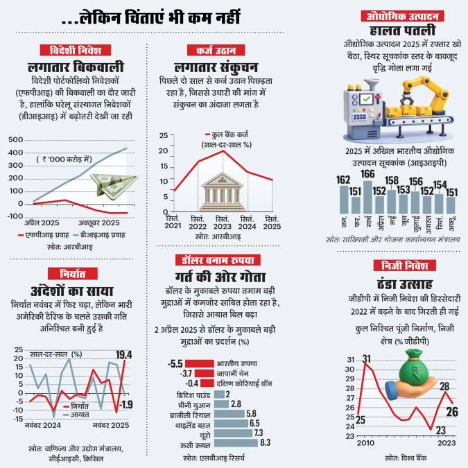 चौथी चिंता देश के बाहरी माहौल की है. अक्तूबर में निर्यात 2.1 फीसद घटा, जिसकी बड़ी वजह इंजीनियरिंग और टेक्सटाइल सामान की कमजोर वैश्विक मांग रही. जुलाई से अब तक रुपया डॉलर के मुकाबले करीब 3 फीसद कमजोर हुआ और दिसंबर में कई बार 90 रुपए प्रति डॉलर के मनोवैज्ञानिक स्तर के आसपास पहुंच गया.
