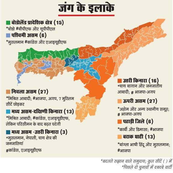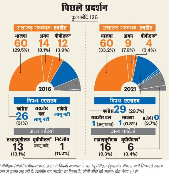 2021 में भाजपा ने अपनी 60 सीटें बनाए रखीं और वोट हिस्सेदारी 29 से बढ़ाकर 31 फीसद कर ली. एनडीए की कुल सीटों में अलबत्ता 11 की गिरावट आई, जो मुख्यत: इसलिए हुआ क्योंकि सहयोगी दल असम गण परिषद (अगप) 14 सीटों से घटकर नौ पर आ गई.