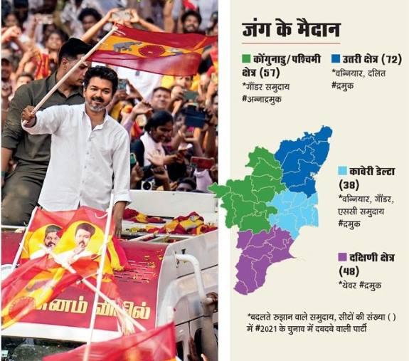 सबसे बड़ा सवाल तो यह है कि विजय किस पार्टी के वोट बैंक में सेंध लगाएंगे. श्रीनिवासन के मुताबिक, ''जहां भी विजय जाते हैं, वहां भारी भीड़ जुटती है. क्या पार्टी अन्नाद्रमुक को मिलने वाले द्रमुक-विरोधी वोटों मे सेंध लगाएगी? या द्रमुक के अल्पसंक्चयक वोटों में? या युवा वोटों को आकृष्ट करेगी जो पहले सेंतमिलन सीमान की पार्टी नाम तमिलर काच्चि (एनटीके) को मिले थे (2021 में 6.6 फीसदी)? अभी कुछ नहीं कह सकते.’’