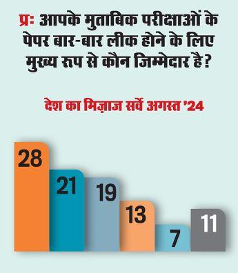 देश का मिज़ाज सर्वे से पता चलता है कि सबसे व्यापक धारणा—28.2 फीसद—यह है कि पेपर लीक के इस साल हुए मामलों के लिए सबसे पहले केंद्र सरकार जिम्मेदार है और उसके बाद वे प्राधिकारी जिन्हें ये परीक्षाएं आयोजित करने का काम सौंपा गया (21.2 फीसद). 18.8 फीसद जितने ज्यादा उत्तरदाता मानते हैं कि राज्य सरकारें जिम्मेदार हैं जबकि 13.3 फीसद प्रश्नपत्र तैयार करने और बांटने की प्रक्रिया में शामिल लोगों को दोषी मानते हैं. महज 7.3 फीसद को पेपर लीक के पीछे किन्हीं संगठित गिरोहों की भूमिका का शक है.