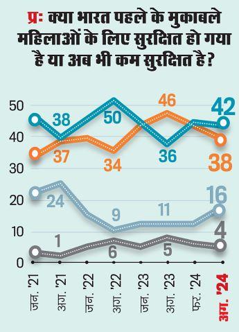 एक बात परेशान करने वाली है. और वह यह कि पिछले आठ देश का मिज़ाज सर्वेक्षणों में शामिल आधे से भी कम उत्तरदाता मानते हैं कि भारत महिलाओं के लिए पहले से ज्यादा सुरक्षित हुआ है. दरअसल, इस बार महज 42.3 फीसद ने ऐसा कहा जो फरवरी 2023 के सर्वे के 43.1 फीसद उत्तरदाताओं से थोड़े ही कम हैं.