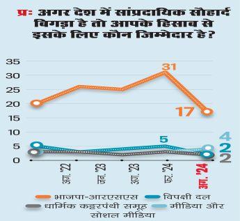 अहम बात यह कि भारतीय जनता पार्टी (भाजपा) और उसके वैचारिक अभिभावक राष्ट्रीय स्वयंसेवक संघ (आरएसएस) को सांप्रदायिक सौहार्द में कमी के लिए अब भी सबसे पहले जिम्मेदार माना जाता है, पर यह धारणा कम होती जा रही है. मात्र 17.1 फीसद उत्तरदाता ऐसा सोचते हैं, जो महज छह महीने पहले के 31 फीसद से खासे कम हैं. उधर, महज 2.2 फीसद को लगता है कि ऐसी गिरावट के लिए देश के विपक्षी दल जिम्मेदार हैं. दरअसल, 3.8 फीसद उत्तरदाता इसका ठीकरा मुख्यधारा के मीडिया और सोशल मीडिया के सिर पर फोड़ते हैं.
