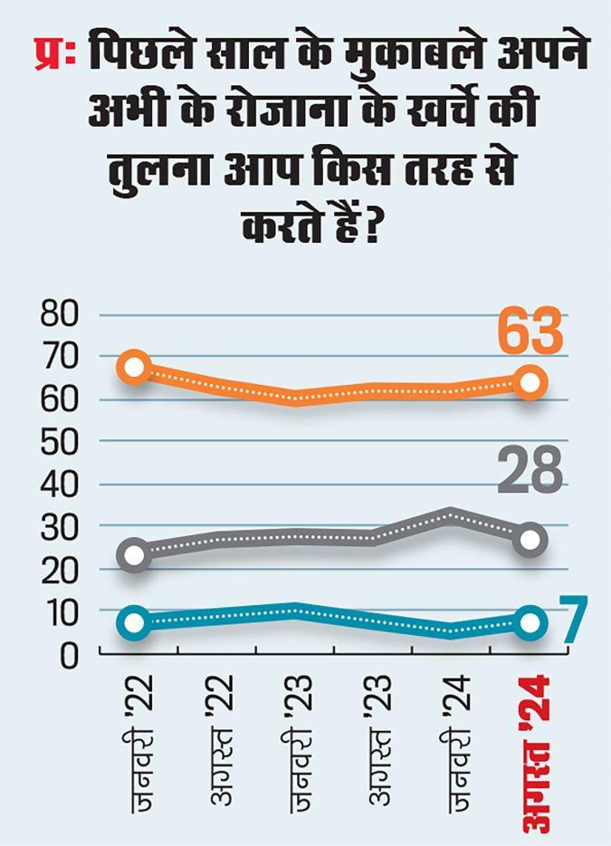 ऊंची कीमतें आम आदमी के वित्त पर निश्चित रूप से दबाव डाल रही हैं. देश का मिज़ाज सर्वेक्षण में अच्छी-खासी संख्या में 63 फीसद उत्तरदाताओं ने बताया कि अपने मौजूदा खर्चों का बंदोबस्त कर पाना बहुत मुश्किल हो गया है, जबकि अन्य 28 फीसद का मानना है कि उनके खर्चे बढ़े हैं लेकिन फिर भी वे प्रबंधन योग्य हैं. मात्र 7 फीसद कहते हैं कि उनके खर्चों में कमी आई है.