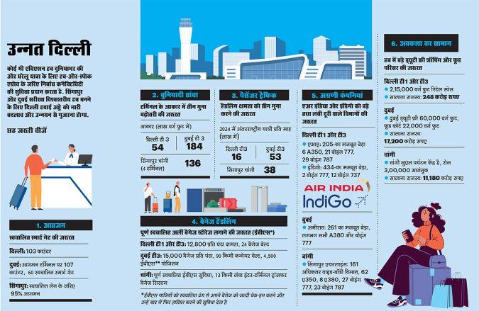 चार रनवे के अलावा इस हवाई अड्डे ने 3,000 वर्ग मीटर आई-आई (इंटरनेशनल टू इंटनेशनल) ट्रांसफर एरिया भी जोड़ा है, जो मूल के आकार से दोगुना है. डीआईएएल के सीईओ विदेश कुमार जयपुरियार कहते हैं, "पहले चरण में ऐसे घरेलू से अंतरराष्ट्रीय यात्रियों की हिस्सेदारी बढ़ाने पर ध्यान दिया जाएगा जो सीधी कनेक्टिविटी के लिए भारतीय विमान कंपनियों को चुनते हैं. इसके लिए हम उड़ानें संभालने की अपनी क्षमता बढ़ा रहे हैं और हब परिचालनों के लिए जरूरी स्लॉट बैंक बनाने के लिए भी एयरलाइंस के साथ मिलकर काम कर रहे हैं."