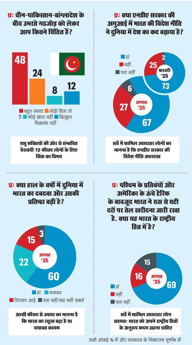 इस साल की शुरुआत के 25.4 फीसद के मुकाबले अब 27.4 फीसद भारत की कूटनीतिक प्रभावशीलता को लेकर सवाल उठा रहे हैं. वैश्विक प्रभाव के ज्यादा बड़े पैमाने पर 60 फीसद को लगता है कि हाल के वर्षों में भारत का वैश्विक सम्मान बढ़ा है, जबकि 21.7 फीसद का मानना है कि इसमें कोई बदलाव नहीं आया. 14.5 फीसद का ही कहना है कि इसमें गिरावट आई.