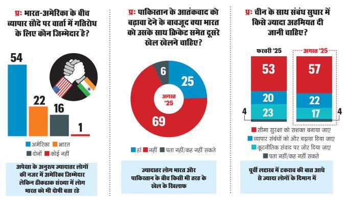 भारत को टैरिफ विवाद से कैसे निबटना चाहिए? इसके जवाब में 60.7 फीसद का मानना था कि भारत को अपने हितों के साथ समझौता न करते हुए बातचीत जारी रखनी चाहिए, जबकि 23 फीसद का कहना था कि भारतीय अर्थव्यवस्था में अमेरिका के ऊंचे टैरिफ से निबटने का बूता है. दिलचस्प तौर पर 8.7 फीसद का कहना था कि भारत को अमेरिका की मांगें मान लेनी चाहिए. भारत-अमेरिका व्यापार वार्ताओं के ठप पड़ने की वजह भिन्न प्राथमिकताएं रही हैं.