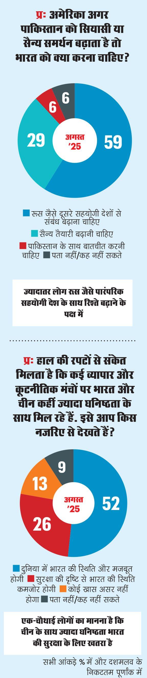 दोनों पक्ष कैलाश मानसरोवर यात्रा फिर शुरू करने, व्यापार रास्ते फिर खोलने और सीधी उड़ानों की शुरुआत सरीखे कदमों के साथ दोतरफा रिश्तों को पटरी पर लाने की कोशिश कर रहे हैं. फिर भी अविश्वास कायम है. पूर्वी लद्दाख में 2020 की चीनी घुसपैठ को याद करते हुए भारतीय सैन्य प्रतिष्ठान चौकन्ना है. जनता भी इस पक्ष में है. चीन के साथ भारत के रिश्तों की प्राथमिकताएं गिनाने को कहने पर 56.5 फीसद ने सरहदों पर सुरक्षा बढ़ाने की वकालत की, जबकि 22 फीसद ने व्यापार को प्राथमिकता दी.