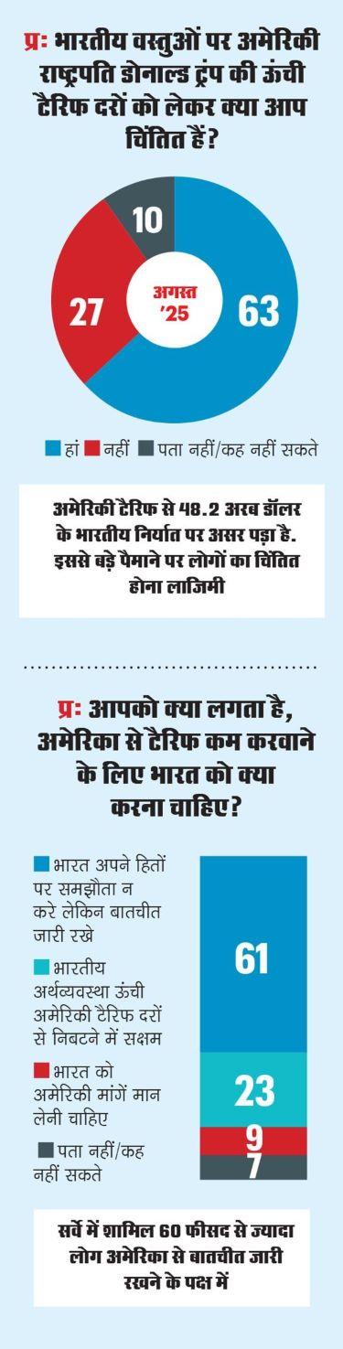 वैसे सरकार ने कहा है कि वह राष्ट्रीय हितों और निर्यातकों की रक्षा के लिए जरूरी कदम उठाएगी, फिर भी कई भारतीय चिंतित हैं. अगस्त 2025 के इंडिया टुडे देश का मिज़ाज सर्वे में 63 फीसद लोगों ने ऊंचे टैरिफ को लेकर चिंता जाहिर की. हालांकि उनमें से 27 फीसद से ज्यादा बहुत चिंतित नहीं. विश्लेषकों का कहना है कि अमेरिकी टैरिफ से निबटने के लिए भारत को कूटनीतिक बातचीत, टैरिफ से प्रभावित होने वाले क्षेत्रों को सहारा देने और दूसरी जगहों पर बाजार खोजने पर जोर देना चाहिए.