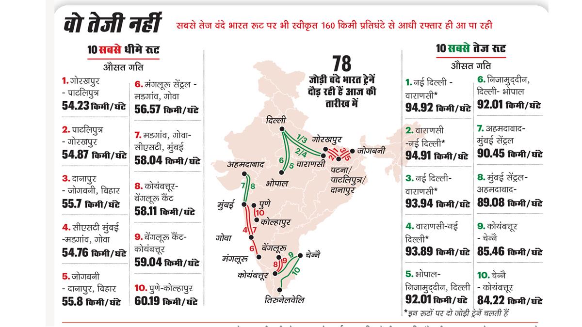 लेकिन यह सपना ही रह गया और 2020-21 में ट्रेन 84.5 किमी/घंटा की रफ्तार ही ले सकी जो 2023-24 तक घटकर 76.25 किमी/घंटा हो गई. रूटों के मुताबिक भी रफ्तार अलग-अलग है. नई दिल्ली-वाराणसी सेवा की औसत गति 95 किमी/घंटा है. जबकि कोयंबत्तूर-बेंगलूरू सिर्फ 58 किमी/घंटा की रफ्तार से चलती है, जो कई आम एक्सप्रेस ट्रेनों से भी धीमी गति है (देखें-स्लो कोच). यहां तक कि अपने सबसे तेज ट्रैक पर, जैसे कि दिल्ली-आगरा लाइन के कुछ हिस्सों में भी ट्रेन कुछ क्षणों के लिए 160 किमी/घंटा की गति ले पाती है और फिर ब्रेक लग जाता है. इस पर अमूमन यात्रा करने वाले 42 वर्षीय सोम बसु कहते हैं, ''मैंने तेज गति के लिए ज्यादा पैसे दिए, लेकिन हम शताब्दी की तुलना में सिर्फ 25 मिनट ही बचा सके. मैं शताब्दी से जा सकता था.'' वंदे भारत का टिकट 1,100 रु. और शताब्दी का 900 रु. का है, ऐसे में उनके जैसे यात्रियों को हैरानी होती है कि समय की बचत के बजाय सिर्फ आराम के लिए इतना पैसा चुकाना कहां तक वाजिब है.