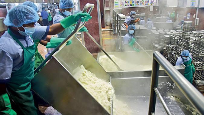 बंगलूरू में सुबह की पहली किरण फूटने से काफी पहले ही एक एसेंबली लाइन उत्पादन की अपनी प्रक्रिया शुरू कर देती है. इसकी पूरी प्रक्रिया गुरुत्वाकर्षण के सिद्धांत की तर्ज पर काम करती है और तीन स्तरों पर ऊपर से नीचे की ओर चलती है. सबसे ऊपरी मंजिल पर रखे कई टन चावल, सब्जियों और खाना पकाने की दूसरी सामग्री को उसके ठीक नीचे वाली मंजिल पर भेजा जाता है, जहां विशेष मशीनें उन्हें पकाने से पहले की प्रक्रिया के लिए तैयार करती हैं.