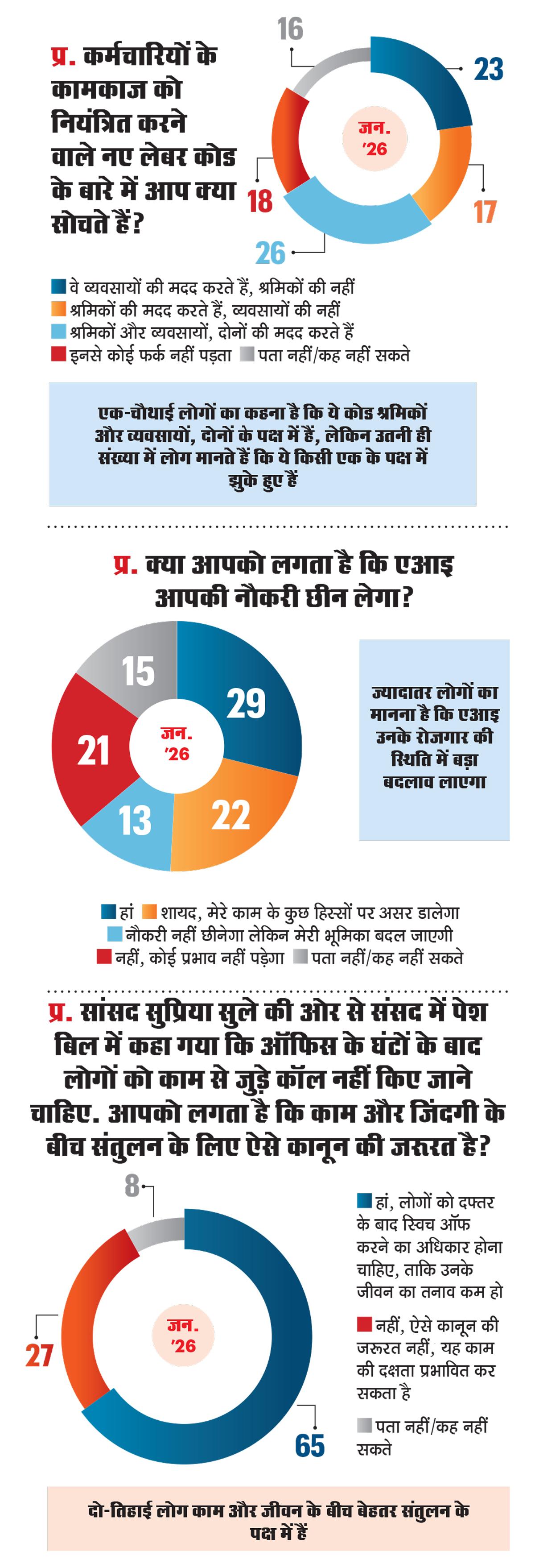 एआइ को लेकर चिंता साफ है: लगभग हर तीन में से एक व्यक्ति को डर है कि एआइ उसकी नौकरी छीन सकता है. 22.3 फीसद मानते हैं कि काम के कुछ हिस्से जरूर खत्म होंगे. इसी के साथ 65.4 फीसद लोग काम से 'डिस्कनेक्ट होने के कानूनी अधिकार' के समर्थन में हैं, जैसा कि संसद में प्रस्तावित है.