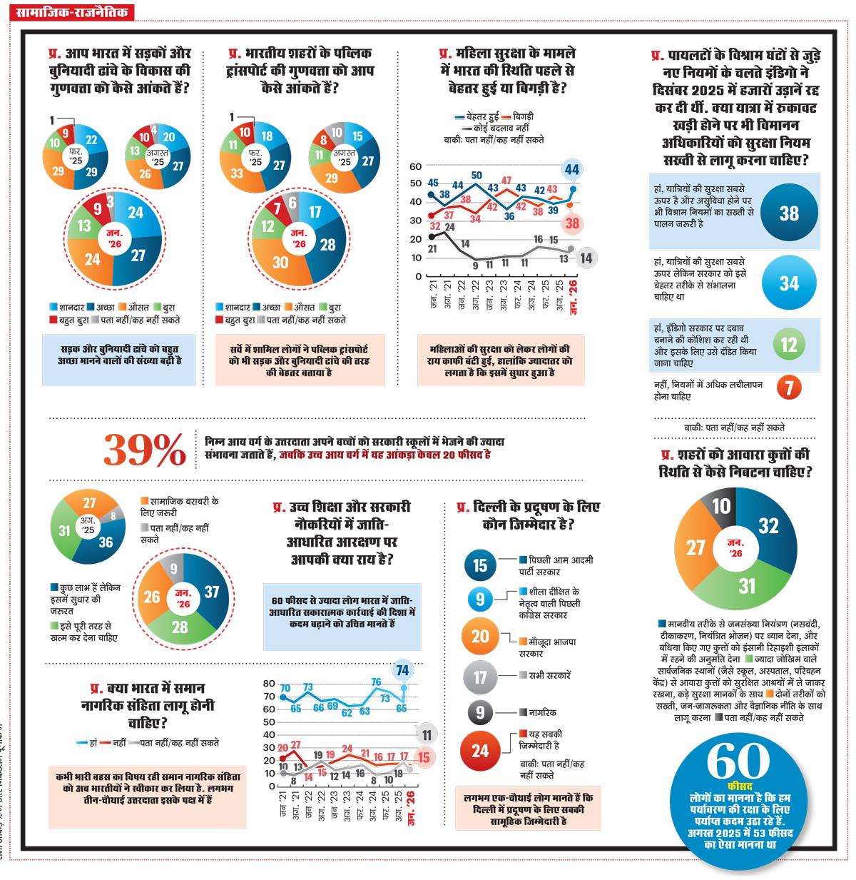 जाति आधारित आरक्षण पर बहस आज भी विभाजनकारी है. 37.3 फीसद लोग मानते हैं कि इसमें फायदे हैं लेकिन सुधार की जरूरत है. यह संकेत है कि लोग टूट-फूट नहीं, समायोजन चाहते हैं. अगस्त 2025 के मुकाबले कड़ा विरोध थोड़ा नरम पड़ा है. समान नागरिक संहिता भाजपा के एजेंडे का अहम हिस्सा रही है. जनवरी 2026 में इसके समर्थन में 73.9 फीसद लोग हैं, जो अगस्त 2025 के 65.1 फीसद से काफी ज्यादा है और पिछले पांच साल के उच्च स्तर के आसपास है.