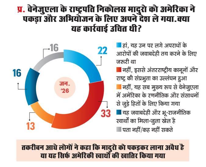 उधर, अमेरिका के हाथों वेनेजुएला के राष्ट्रपति निकोलस मादुरो को नार्को-टेररिज्म के आरोपों में पकड़ कर अपने देश ले जाने पर 33 फीसद का कहना है कि इस कार्रवाई से अंतरराष्ट्रीय कानून और राष्ट्रीय संप्रभुता का उल्लंघन हुआ, वहीं 22.4 फीसद ने अमेरिकी कार्रवाई का समर्थन किया.