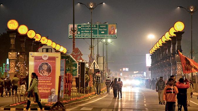 हम आगे बढ़े, मैं यह देखकर दंग रह गई कि शहर कितना बदला हुआ है. मुख्य सड़कें चौड़ी की गई हैं. सभी दुकानों के मुहानों को जयपुर के बलुआ पत्थर के रंग में रंगा गया है और तड़क-भड़कवाले होर्डिंग के बजाय सुंदर मंदिर डिजाइन के साथ एक जैसे नेमप्लेट लगा दिए गए हैं. स्ट्रीट लैंप पर राम के धनुष और हनुमान की गदा के चिह्न अंकित हैं. मंदिर तक जाने वाली मुख्य सड़क धर्म पथ पर स्ट्रीट लैंप में सूर्य के समान गोलाकार रोशनी है, जो शायद राम के सूर्यवंशी होने का प्रतीक है.