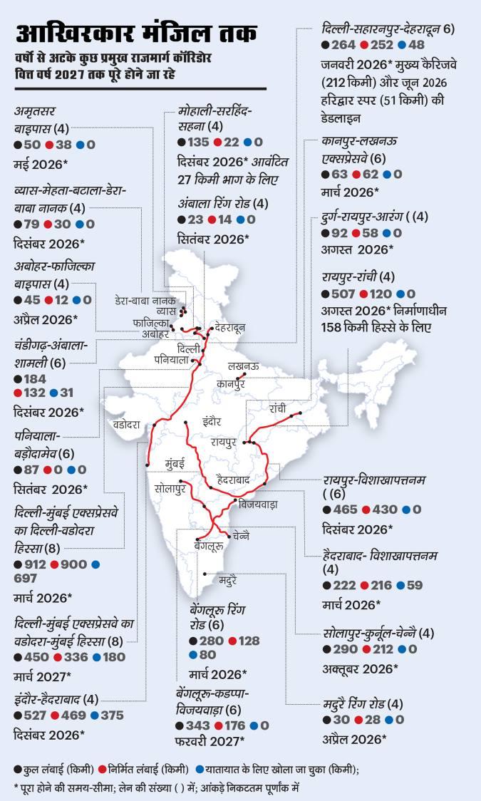 सरकार की राजमार्ग परियोजनाओं के केंद्र में रहा 1,386 किलोमीटर लंबा दिल्ली-मुंबई एक्सप्रेसवे पिछले साल अक्तूबर तक पूरा होने की उम्मीद थी. 2025 के अंत तक इस परियोजना की लागत 71,718 करोड़ रुपए थी, जो भारतीय इतिहास में सड़कों के मामले में सबसे ज्यादा है. संसद में गडकरी ने स्वीकारा कि भूमि अधिग्रहण की समस्याओं, अनुमतियों में देरी और जटिल शहरी इंटरफेस के कारण उनका मंत्रालय इस परियोजना में देरी का सामना कर रहा है. ऐसी चुनौतियां कई अन्य राजमार्ग परियोजनाओं के सामने भी हैं.