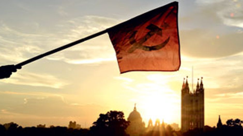 गोपालन भवन आज भुतहा इमारत बन चुका है. सीपीएम के नौ सांसद संभवतः संसद के भीतर इस उम्मीद में जमे हुए हैं कि सत्ता में गिर चुकी अपनी साख को अपने फेफड़ों की सामूहिक ताकत से कैसे भी बचा ले जाएंगे. भवन के दूसरे तल पर स्थित पार्टी महासचिव प्रकाश करात के कमरे के बाहर चमकदार लाल रंग की सजधज के बीच अल्युमिनियम का एक ऐश ट्रे पड़ा हुआ है. उनके कमरे के भीतर पीछे वाली दीवार पर एक पुराना रूसी पोस्टर लगा है जिस पर रूसी में लिखा है, ‘‘रोशन भविष्य का रास्ता अक्तूबर क्रांति से निकलता है.’’