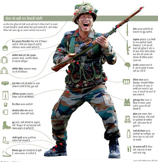 इनमें चीन की सीमा पर तैनात हो रही पर्वतीय हमलावर टुकडिय़ों के लिए जरूरी तोपों से लेकर पारंपरिक युद्ध में बढ़त रखने के लिए जरूरी विमान और दूसरे उपकरण तथा नौसेना के लिए जरूरी सामान शामिल हैं. अधिकारी और जानकारों का कहना है कि इसके लिए यूपीए सरकार का आधुनिकीकरण से परहेज और राष्ट्रीय संसाधनों में सेना की हिस्सेदारी भी कम करने का रवैया जिम्मेदार है.