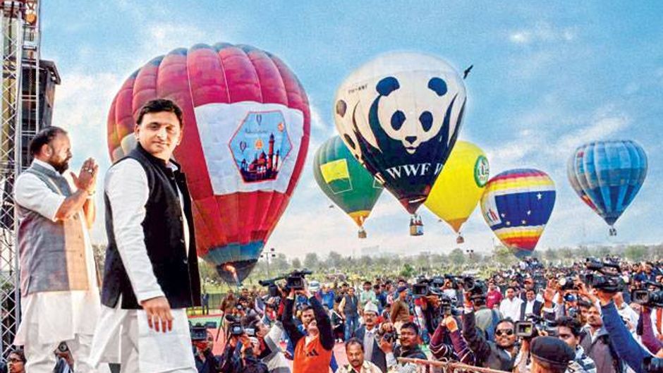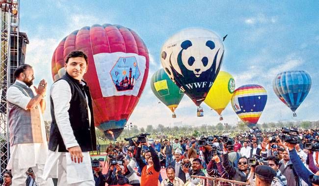 राजधानी लखनऊ में इस बार 14 फरवरी का दिन कुछ खास था. प्रेम के त्योहार यानी वैलेंटाइन डे की सुबह से 'हॉट एयर बैलून' लोगों को नवाबी शहर की आसमानी सैर करा रहे थे. शाम को करीब पांच बजे गोमतीनगर में मौजूद देश के सबसे बड़े जनेश्वर मिश्र पार्क में पॉप गायिका शिल्पा राव के सुरों का जादू युवाओं के सिर चढ़कर बोल रहा था. 'सजदे में यूं ही झुकता हूं... ', 'मौला मेरे मौला..' जैसे गानों से शिल्पा राव ने पूरे माहौल में रूमानियत घोल दी थी. इसी बीच मुख्यमंत्री अखिलेश यादव का काफिला कार्यक्रम स्थल पर पहुंचा. मंच के बगल में लगी लखनऊ के दुर्लभ चित्रों की प्रदर्शनी का उद्घाटन करने के बाद अखिलेश यादव सुरक्षा घेरा छोड़कर अपने बच्चों के साथ हॉट एयर बैलून पर सवार हो गए और ऊपर जाकर हाथ हिलाकर युवाओं का अभिवादन किया.