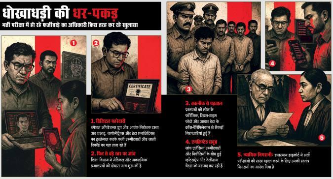 दूसरे की जगह परीक्षा देना बार-बार अपनाया जाने वाला तरीका है. धन के बदले परीक्षा देने वाले 'सॉल्वर’ जाली पहचानपत्रों या छेड़छाड़ की गई बायोमेट्रिक्स का इस्तेमाल करके दूसरों के लिए परीक्षा में बैठे. हाल के महीनों में एआइ-आधारित बायोमेट्रिक प्रणालियों ने बार-बार ऐसे अपराध करने वालों का पता लगाने में एसओजी और एटीएस की मदद की है. कॉन्स्टेबलों की भर्ती और डिप्लोमा इन एलीमेंट्री एजुकेशन की दो अलग-अलग परीक्षाओं में वही 13 लोग छद्म उम्मीदवार के तौर पर परीक्षा देते पाए गए.