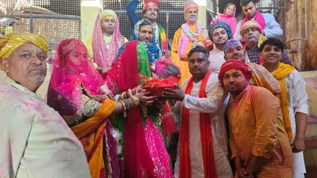 सोलह श्रृंगार से सजी, माथे पर बिंदी, मांग में सिंदूर, हाथों में चूड़ियां और पांव में पायल की हल्की छनक. लंबा घूंघट ओढ़े जब राधा की सखी लाडलीजी मंदिर की ऊंची सीढ़ियों से नीचे उतरती हैं, तो ढोल-नगाड़ों की गूंज पूरे बरसाना में 24 फरवरी की सुबह फैल जाती है.