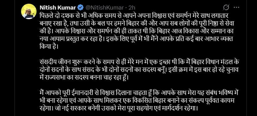 होली का अगला दिन. 11 बजने में कुछ मिनट पहले बिहार के मुख्यमंत्री नीतीश कुमार ने सोशल मीडिया पर एक पोस्ट करके अपनी तरफ से यह साफ कर दिया कि वे राज्यसभा जा रहे हैं, दूसरे शब्दों में कहें तो वे अब बिहार के मुख्यमंत्री नहीं रहेंगे.